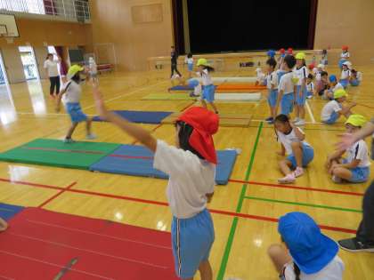 前転、後転、開脚前転などの技に真剣に取り組みました。
