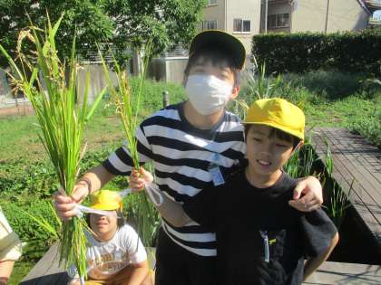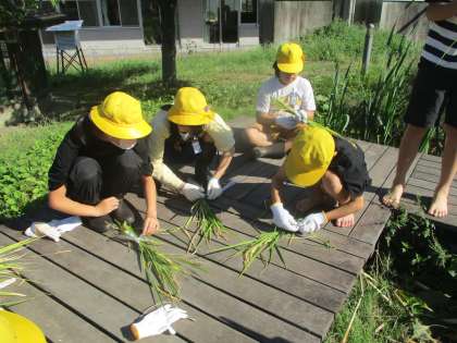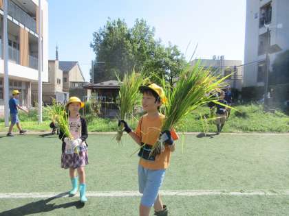 稲を刈った後は、タフロンテープを使って稲を束にして、稲架掛けしやすいようにまとめました。子供たちは自分の手で稲を刈り、米を収穫できて満足そうな表情を浮かべていました。