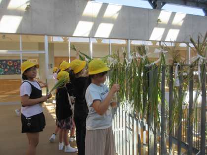 収穫した稲は、中庭テラスで天日干しし、稲架掛けをして自然乾燥させました。3週間ほど乾燥させる予定です。子供たちは、3週間後の脱穀や籾すりを今から楽しみにしているようでした。