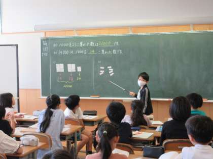 算数科では「大きい数のしくみ」の学習をしています。自分の考えをみんなに共有しながら、大きい数の計算について考えています。