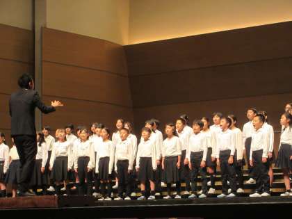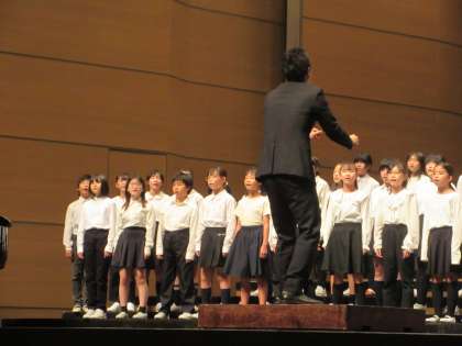 中央小学校の出番は、第1部の3番目でした。他の小学校の発表を聴きながら、少しずつ緊張を高めていく子供たちでしたが、ステージの上で堂々と合唱することができました。