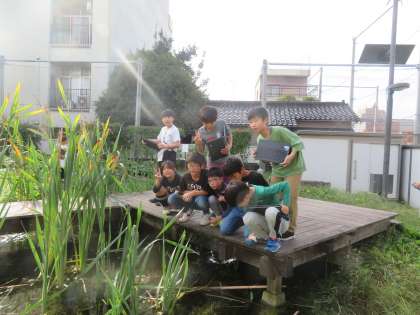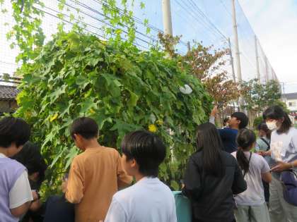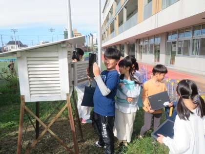 理科では、すずしくなったころの様子について学習しています。暑い時期の生き物との違いや、ヘチマの様子の変化を記録しました。百葉箱で、気温もしっかりと測ることができました。