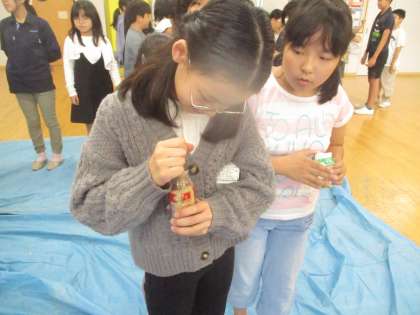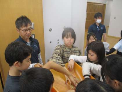 籾すり作業の後、子供たちは、籾殻と玄米を実際に触りながら比べていました。籾すりされた玄米の一部を手作業で精米する体験もしましたが、とても大変だったようです。