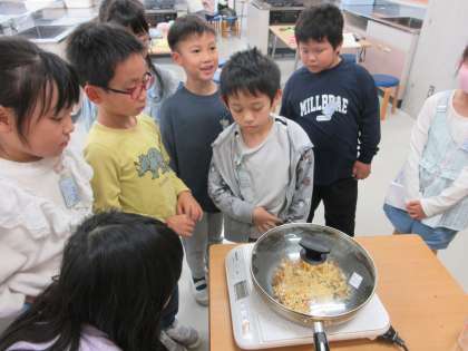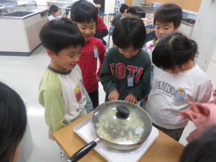 粒がはじけてポップコーンになっていくところを見て歓声をあげ喜ぶ子どもたちでした。