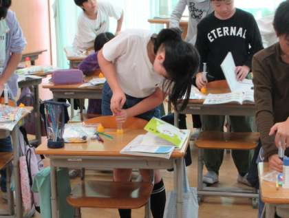 理科では、とじこめた空気と水は押されるとどうなるのか、実験をして確かめています。実験を通して、手応えの違いから、空気と水の性質の違いを学んでいます。