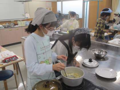 家庭科「食べて元気!ご飯とみそ汁」の学習では、日本の伝統的な日常食であるご飯とみそ汁について調べてきました。今回の調理実習では、実際に米を鍋で炊き、味噌汁をつくりました。班全員で協力して、具だくさんのおいしい味噌汁をつくることができ、子供たちはとても満足そうでした。また、セントラル水田やバケツ稲で育てた米が炊きあがると、とても嬉しそうに、感謝しながら残さずおいしく食べていました。自分で育てた米を自分で食べることができ、達成感を感じている子供たちでした。