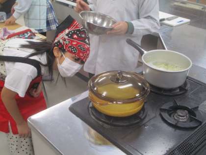 写真は、1組の調理実習の様子です。