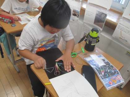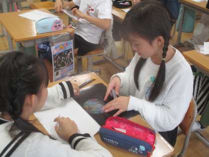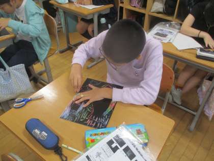 図画工作科「消してかく」の学習では、砂消しゴムを使って画用紙の黒色を消し、思い思いの絵を描きました。砂消しゴムの消す力の加減を考えることで、濃淡のある幻想的な作品に仕上がりました。