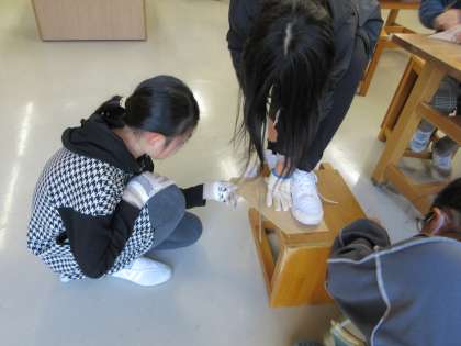 図画工作科の学習では、のこぎりで板を切ることに挑戦しています。友達と協力して、思い思いの形に切っています。作業を繰り返すうちに、のこぎりの使い方が上達してきました。