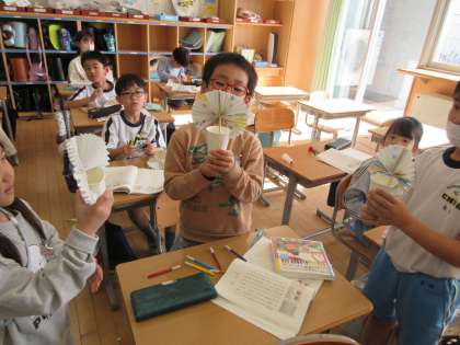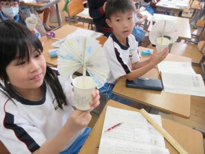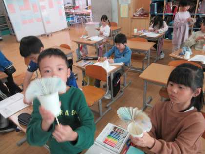 国語の学習で、「紙コップ花火の作り方」という説明文の学習をしています。今日は、文章を読みながら実際に紙コップ花火を作りました。大切な言葉に着目しながら作ることができました。