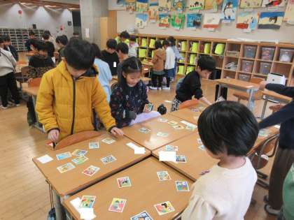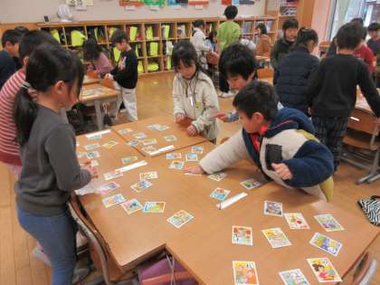1年生は、犬棒かるた(ことわざかるた)です。担任が読む札をよく聞いて取り組んでいます。