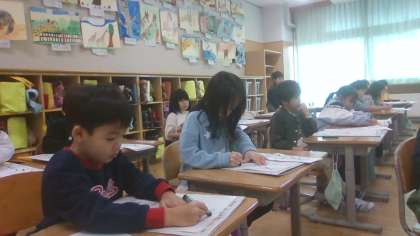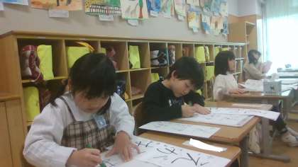 手本をよく見て練習をしています。自分が気を付けたいところを手本に書き込むことで、より目当てをもって取り組む子供たちでした。