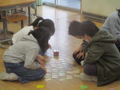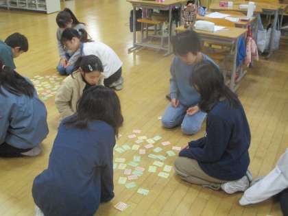 1月のかるた大会に向けて、百人一首の練習をしています。子供たちは、黄札、緑札、橙札の句を繰り返し口にしたり、友達と対戦したりして練習しています。練習では、上の句を聞いただけで札を取り、嬉しそうにする姿や、取ろうと思った札が取れなくて悔しそうにしている姿、また人気のある句が詠まれた時に大盛り上がりする姿など楽しい雰囲気に包まれました。
