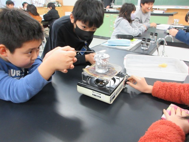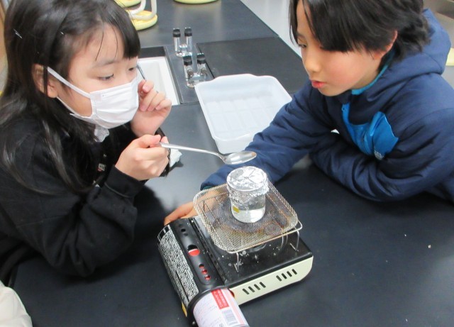「水のすがたと温度」の学習で、湯気の正体を確かめる実験をしました。湯気を金属のスプーンに当てることで水滴がつき、湯気の正体は水であることを確かめました。