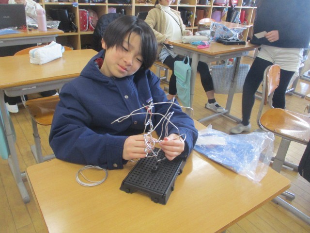 図画工作科「美しく立つはり金」の学習では、針金を使ってワイヤーアートを作成しました。子供たちは、細長い針金を曲げたり立たせたり試行錯誤しながら、形のおもしろさや美しさを感じ取り、自分ならではの作品を完成させていました。