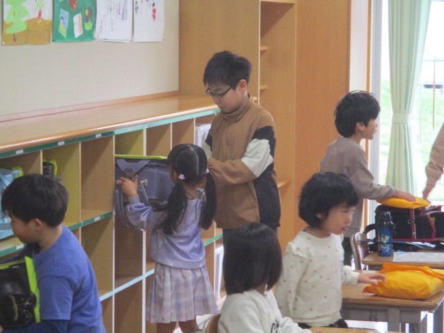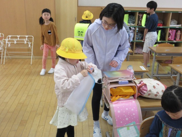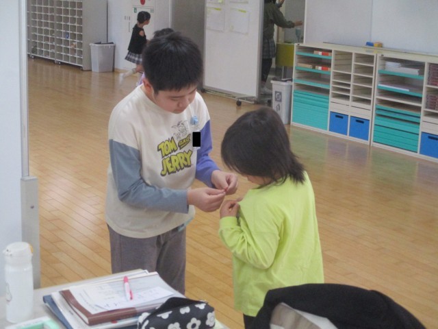 6年生は最高学年として、毎日1年生のお世話をしています。ランドセルの片付けを手伝ったり、名札を付けてあげたりするなど、1年生に寄り添いながら優しく声をかける姿が見られています。