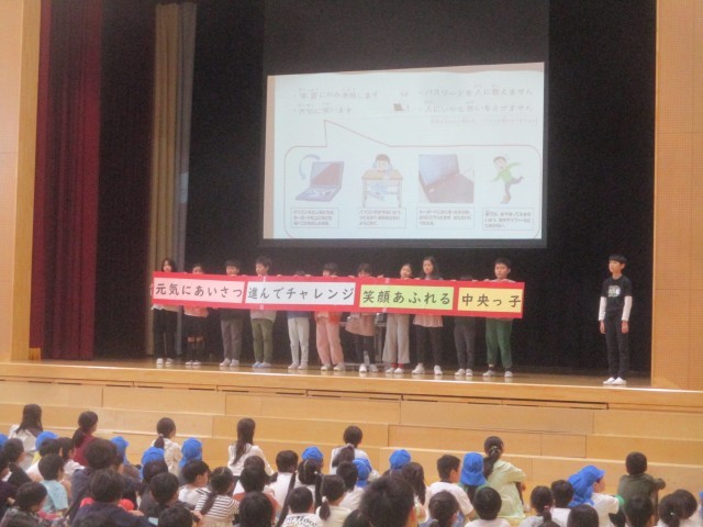 児童会発足式が行われ、セントラル委員会の子供たちから、今年度の児童会スローガン「元気にあいさつ 進んでチャレンジ 笑顔あふれる中央っ子」の発表がありました。また、各委員会の委員長が、それぞれの委員会活動の目標や決意を表明しました。子供たちは、これから自分にできることを考え一生懸命取り組んでいこうと、真剣な表情をしていました。