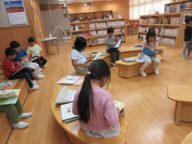 図書室で本を借りました。たくさんある本の中から、自分の好きな本を選んで読みました。