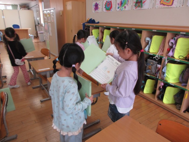 2回目の学校探検は、グループごとに自分の気になる場所へ行きました。職員室、給食室、家庭科室、理科室、プール広場を探検しました。探検後は、自分が見付けたことを友達と伝え合いました。