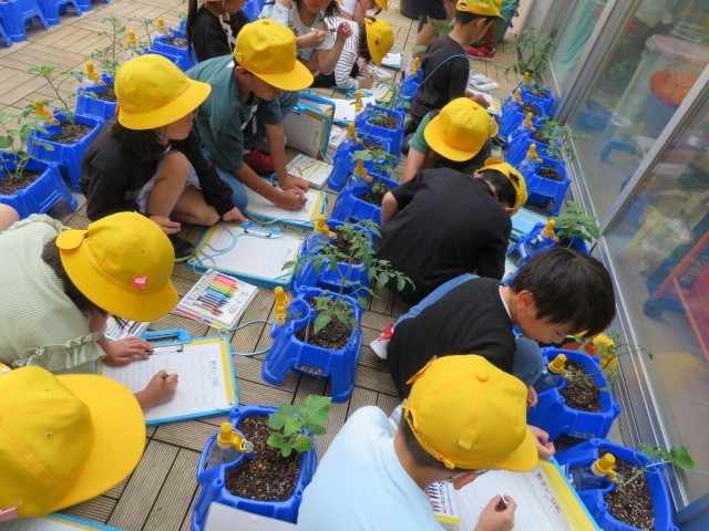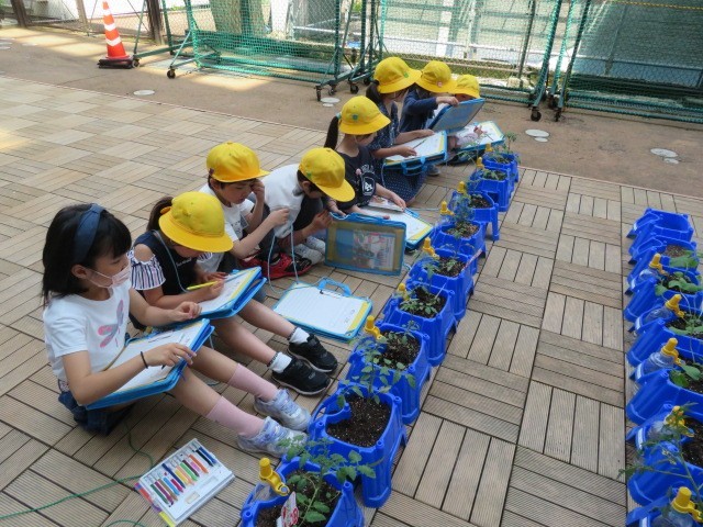 植えた野菜の苗の観察をしました。苗を購入するときに「どれが一番大きく育ちそうかな」「どれが一番育っているかな」とよく観察していた子供も多くいて、「もう大きくなったよ」「花が咲きそうだよ」と嬉しそうに話をしていました。