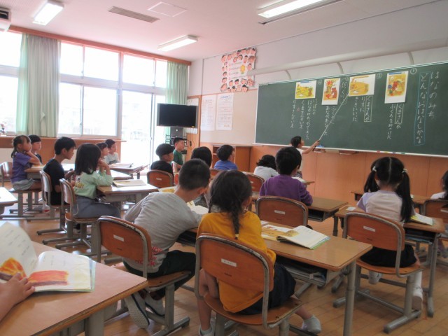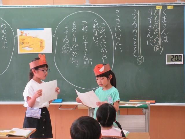 国語では「はなのみち」という物語を学習しています。挿絵を見ながら主人公のくまさんがしたことを確かめたり、くまさんの気持ちを考えたりしました。