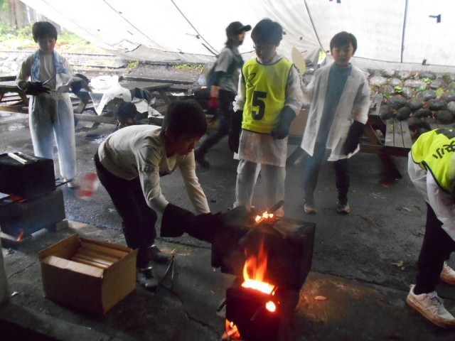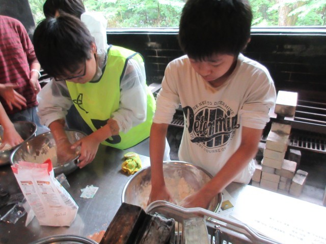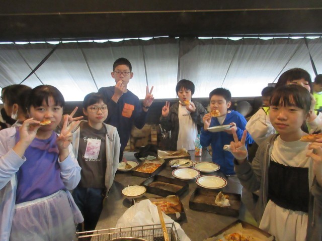 野外炊飯では、ピザづくりを行いました。「生地をこねる」「食材を包丁で切る」「かまどをつくる」「火の調整をする」など、一人一人が自分の役割を果たし、おいしいピザが完成しました。子供たちは嬉しそうに完成したピザを食べていました。