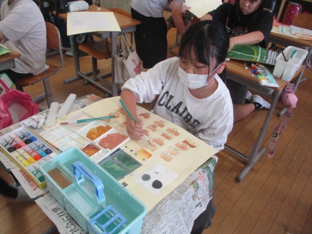 図画工作科「わたしの大切な風景」の学習では、6年間過ごした中央小学校で自分が一番大切な場所・風景を写生しています。小学校生活を振り返り、自分の思い出に残っている場所や風景をクロムブックで撮影し、丁寧に絵に表していました。