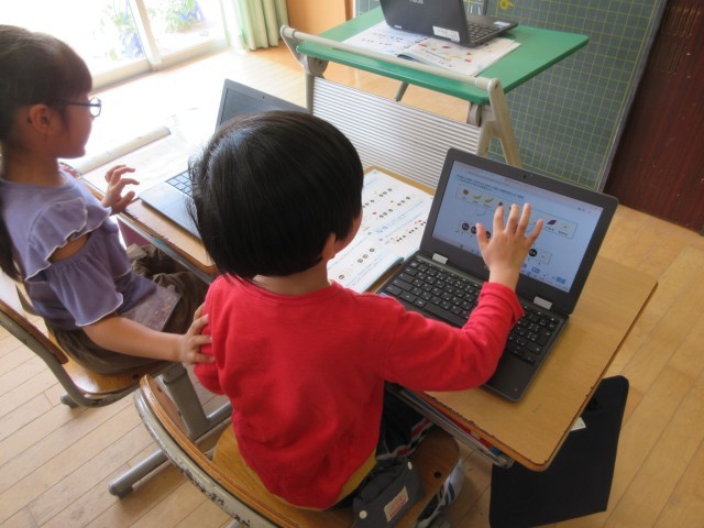 音楽の学習で、クロームブックを使ってリズム作りをしました。イラストを動かすと様々なリズムを作ることができるので、子供たちは自分のオリジナルのリズムを作って楽しみました。