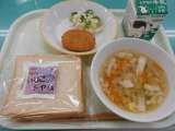 本日の献立は、コロッケ、花野菜サラダ、ひよこ豆のスープ、いちごジャム、です。