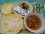 本日の献立は、さばの銀紙焼き、はりはり和え、冬瓜のスープ、なし、です。