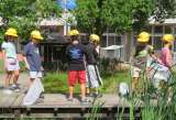 生活科の学習で、ビオトープに出て生き物を探しました。「暑さなんて、何のその!」...