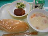 本日の献立は、ハンバーグのケチャップ煮、アスパラサラダ、ホワイトシチュー、です...