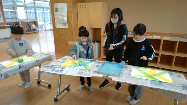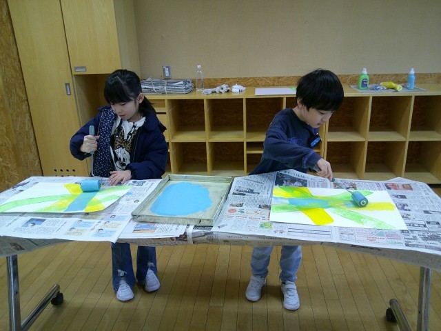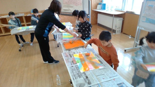 図画工作科の学習では、ローラー版画に挑戦しています。最初はローラーを使って台紙にいろいろな色を塗りました。子供たちは「次は横に塗ってみようかな」「色を重ねるときれいだね」と、それぞれ塗り方を工夫しながら、楽しく作品作りに取り組んでいました。