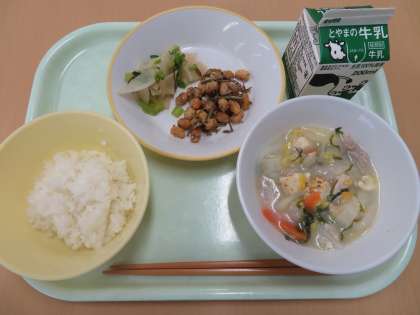 ごはん 牛乳 こざかないりフライビーンズ かぶのこんぶあえ
