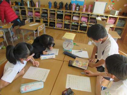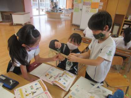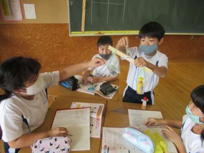 算数科では、重さについて学習しています。初めは、手作りの天秤を使って身の回りの物の重さを比べたり、一円玉で重さを量ったりしました。次に、「はかり」を使って目盛りを読み取り、重さをグラムやキログラムで表すことを学びました。はさみや筆箱、教科書、水筒など身の回りの物を何度も量っているうちに、「一キログラムは大体これくらいかな」と重さの感覚が身に付いてきた子どもたちです。