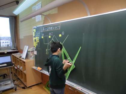 算数では「垂直と平行、四角形」について学習しています。今日は、正方形の作図を行いました。初めはノートの方眼でマス目の数や傾きを使って考えていましたが、これまでに学習した垂直や平行な直線の引き方を利用して正方形が作図できることに気付きました。これからも学習したことを生かしていろいろな問題にチャレンジしてほしいです。