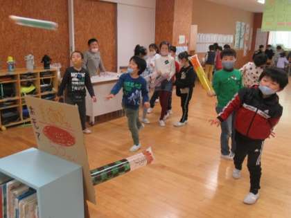 12月3日、1年生は、2年生さんの「おもちゃランド」に招待してもらいました。どのクラスも、1年生のために動きの楽しいおもちゃをたくさん用意し、ルールを工夫していました。優しく遊び方を教わり、どの子供もとても楽しく遊びました。教室に帰ってから「2年生さんが優しく教えてくれて、うれしかったよ」「おもしろいおもちゃで、いっぱいだったよ」と感想を話していました。さらに、「来年は、自分たちもやりたいな」と2年生への思いを膨らませている子供もいました。