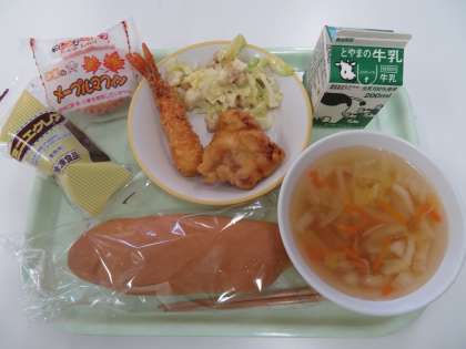 こめこコッペパン 牛乳 ◆ぶたにくのフリッター ◆えびフライ