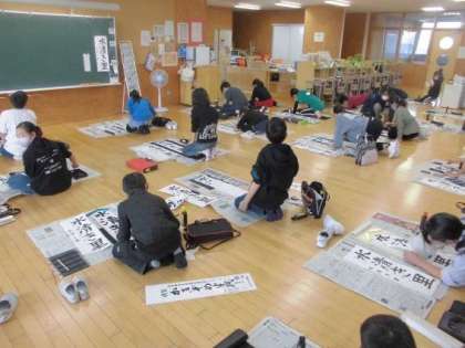 書き初めの練習が始まりました。手本を見ながら、丁寧に書いています。