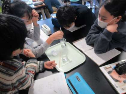 理科では、物の溶け方を調べるための実験をしています。