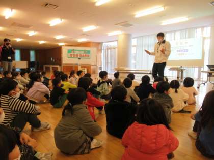 今日は、万引き防止教室を実施しました。少年警察補導員の方から、万引きは犯罪であることや、万引きを絶対にしないために大事なことなどについて教わりました。子供たちは、「万引きをしてしまうと自分だけでなく、家族や周りの人も悲しむことが分かった」「紙芝居を見て、万引きがだめな理由がよく分かった」と学んだことを振り返っていました。