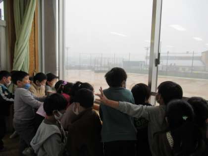 今年の初雪に目を輝かせる子供たち。みんなで雪を見ながら、「たくさん降ってほしいな」「雪だるまつくりたいな」と話をしていました。