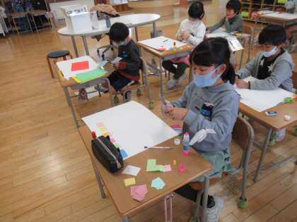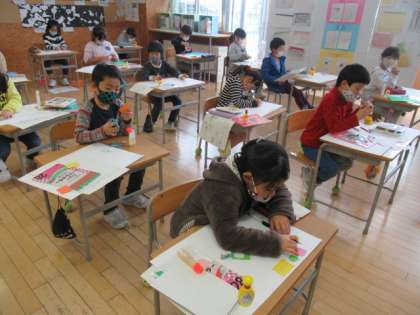 図画工作科では、すごろくをつくっています。スタートからお話をつなげてゴールに行くように考えたり、色紙を使って飾り付けをしたりしました。集中して取り組む子供たちの様子です。