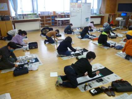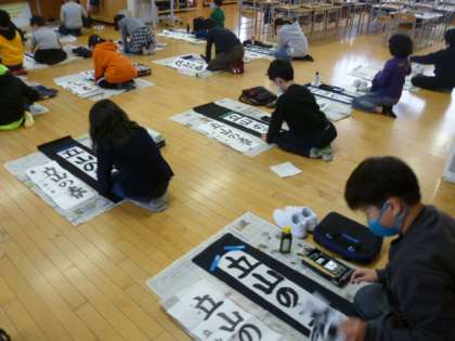 開始の放送がかかるまで、子供たちは正座をして静かに心を落ち着かせていました。その様子から「今までの練習の成果をを出すぞ」という気持ちが伝わってきました。本番ではゆっくりと筆を運ばせ、ていねいに書いていました。最初の作品と比べると、どの子も上達していました。書初大会を通して、また一つ、学年目標の「Step up!」ができたのではないかと思います。