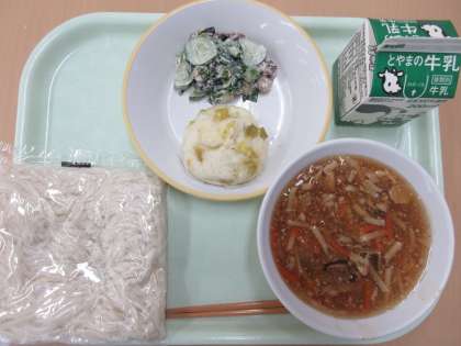 ソフトめん 牛乳 ソフトめんのごもくあんかけ ビーンズサラダ むしパン