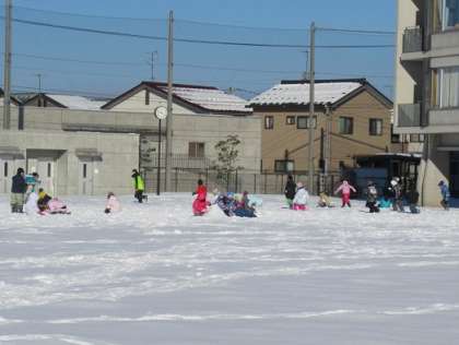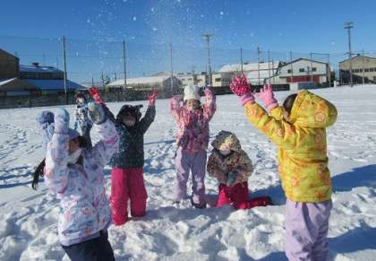 大雪が積もったあとの晴天の日、1年生の子供たちは足跡の付いていない真っ白なグラウンドで雪遊びをしました。気温が低いので、さらさらの雪で、その雪を高く投げ上げると、きらきらと輝き、とてもきれいだと感動していました。また、積雪の下の方のみぞれのようになっている雪は、固まってきており、割ったときにできる塊を集めて塔をつくって楽しみました。ほかにも、寝転んだり、雪合戦をしたり、自分たちの基地をつくったりと、雪ならではの遊びを満喫しました。