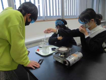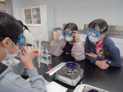 今日は、5種類の透明の水溶液の違いを見付けるために、蒸発させたりにおいをかいだりして比べてみました。実験するときは、安全めがねを付けること、においをかぐときは手であおぐように嗅ぐなど安全に実験する方法も学習していきます。
