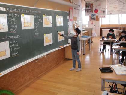算数科「広さの表し方を考えよう」では、面積の求め方を学習しています。今日は長方形の面積の公式を使って、階段のような入り組んだ形の面積を求める問題に挑戦しました。一つの形でも様々な求め方があり、子供たちは「解きやすいな」「分かりやすいな」と思った解き方をノートに写していました。