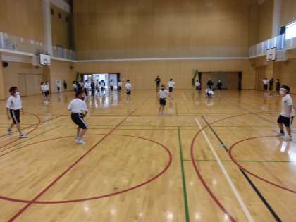 今日は、フリスビーを使ってドッジボールを行う「ドッジビー」をしました。初めは思ったように飛ばないことに難しさを感じた子供たちでしたが、強さや方向を考えて投げることで、だんだんうまく飛ばせるようになっていきました。試合では全員が楽しくフリスビーを投げたりよけたりしていました。