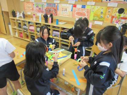 123m花畑でお世話になったグリーンキーパーさんへ感謝の思いを伝えるため、学年で集会の準備をしています。グループに分かれて、プログラムの内容を考えたり、飾りを作ったりとどうしたら喜んでもらえるかを考えながら活動を進めています。企画、準備、当日の進行を全て自分たちで行うため、張り切って取り組んでいる3年生です。